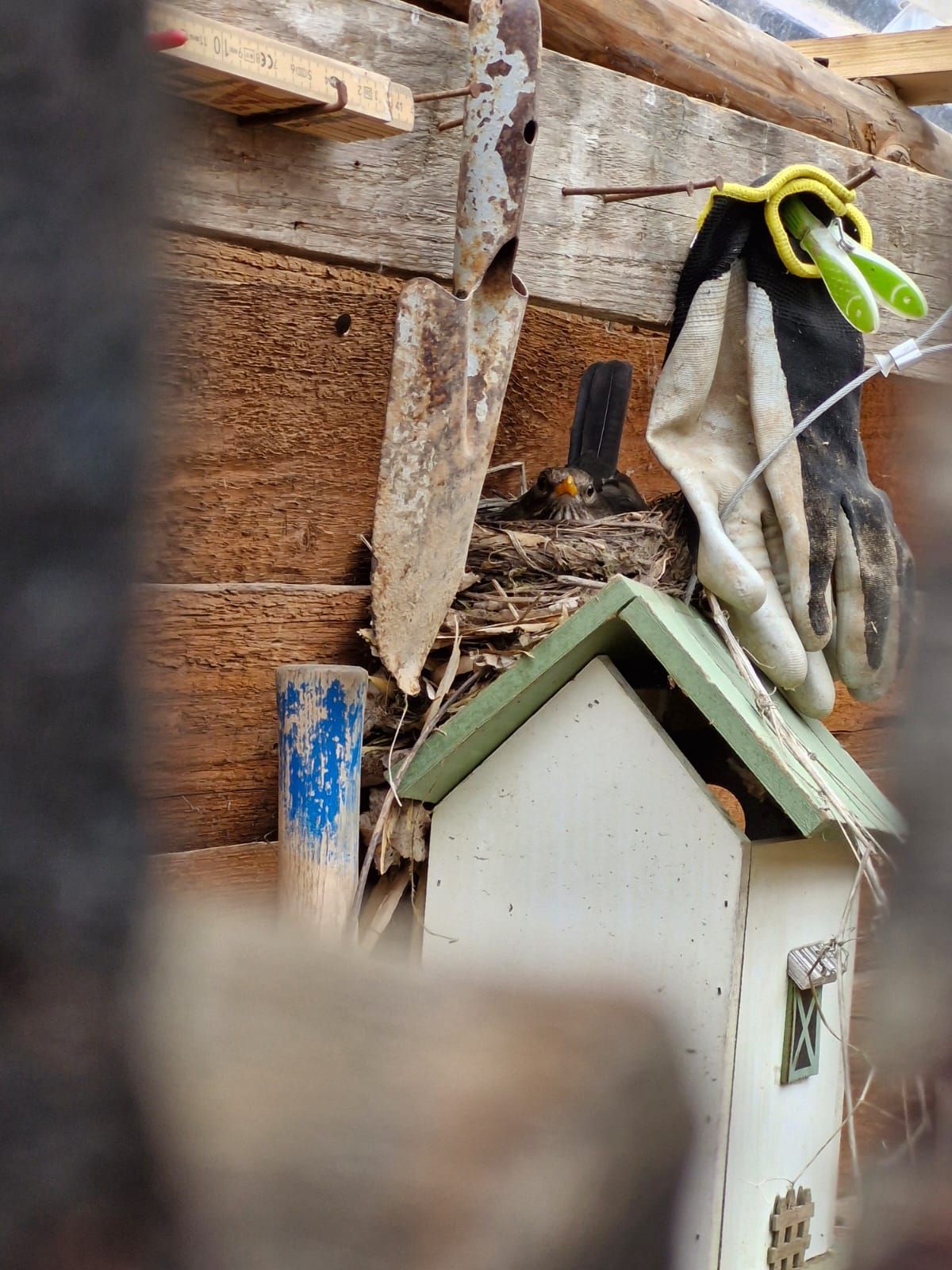 Zuerst dachte ich, ich hätte zu lange mit dem Aufhängen des Nistkastens gewartet, da die Amsel sich kurzerhand innerhalb des Geräteschuppens auf das Dach des Kastens ein Nest gebaut hatte. Nachdem ich ganz vorsichtig den Schuppen betreten und ihr freundlich zugeredet hatte, ließ sie sich auch in den nächsten Wochen nicht stören. Schließlich brauchte ich hin und wieder Gartenwerkzeuge und das Vögelchen sah dies wohl als friedliche Kooperation an.