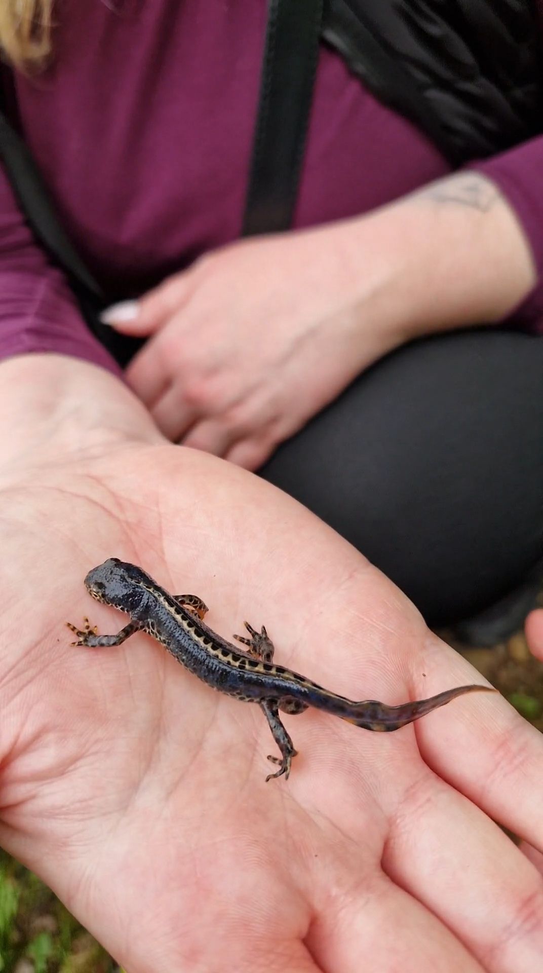 Unten links ein Foto von einem jungen Feuersalamander, der sich am Teich recht wohl zu fühlen scheint. Aufgenommen am 2. Mai 2024.